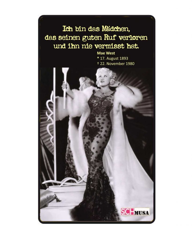 Kehren wir noch einmal zurück zu den Mädchen. Mae West war mehr als eine Schauspielerin, sie galt als Inbegriff der Femme fatale. Sie brach etliche sexuelle Tabus, indem sie beruflich wie auch privat die Freiheit der Liebe und Gleichheit der Geschlechter proklamierte.