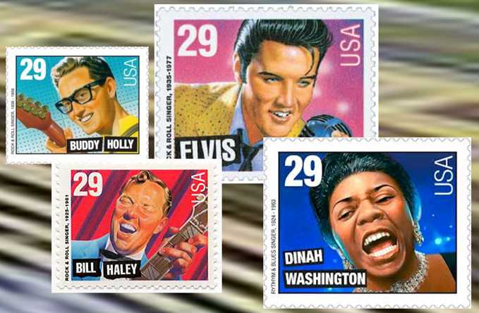 “To celebrate pop music legends” nannte sich ein Satz US-amerikanischer Briefmarken, mit dem Elvis Presley, Bill Haley, Buddy Holly, Otis Redding, Ritchie Valens, Clyde McPhatter und Dinah Washington 1993 geehrt wurden.